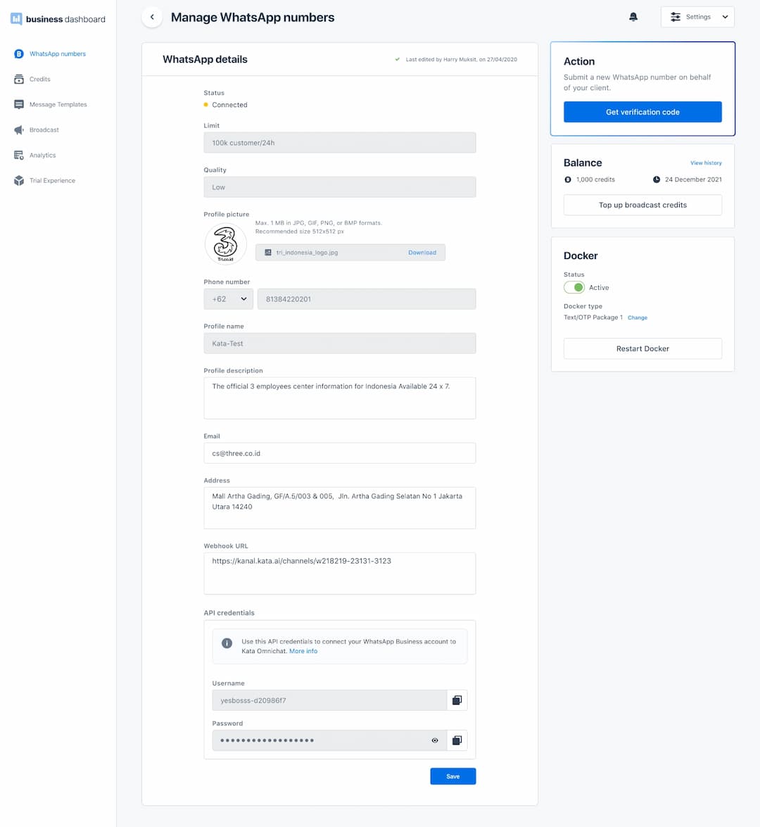 - You have to open your Business Dashboard account > WhatsApp details and then copy username and password from API credentials. Paste the username and password to Kata Omnichat, then the system will automatically generate the webhook URL.